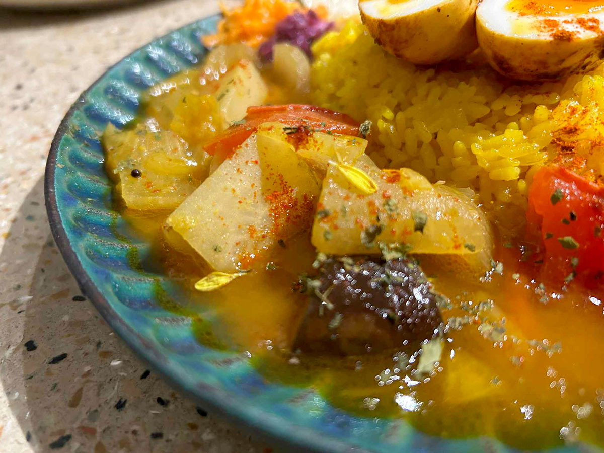 同店は週ごとに3種のカレーを提供する。過去に提供したメニューを確認してみると、「ケララチキンカレー」をメインに、「あさりのココナッツカレー」「牛すじカレー」「スペアリブポークカレー」「厚揚げと野菜のホワイトカレー」、17日限定の「千両なすとひき肉のカレー」など多くの味が楽しめるのも魅力。