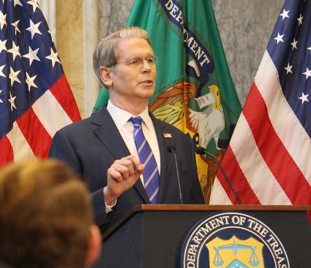 ベセント米財務長官は15日、CNBCテレビに対し、トランプ大統領が日本を訪問する予定だと言明した。写真は記者会見するベセント氏=同日、ワシントン 【時事通信社】