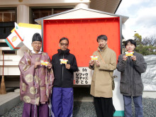 当日は、岡山神社の久山信太郎宮司が祝詞を上げた後、奉納者のデザイン事務所「cifaka(シファカ)」(同)の作元大輔さん、デザインユニット「COCHAE(コチャエ)」の軸原ヨウスケさん、旧久米町の郷土玩具・久米土人形を継承するデザイナーの長友真昭さんと共に除幕式に臨み、目入れを行った。