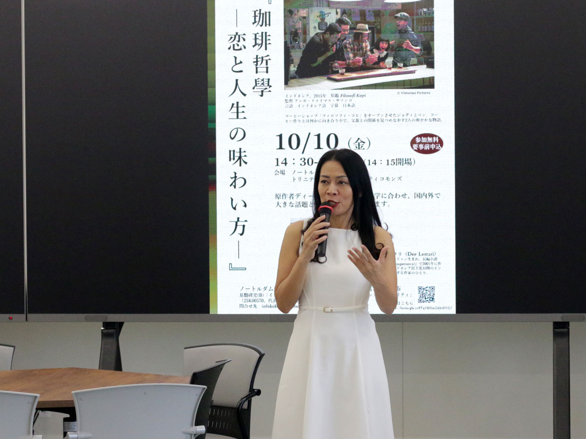 インドネシア映画「珈琲(コーヒー)哲学~恋と人生の味わい方~」を原作者と共に見る上映会が10月10日、ノートルダム清心女子大学(岡山市北区伊福町2)で開かれた。