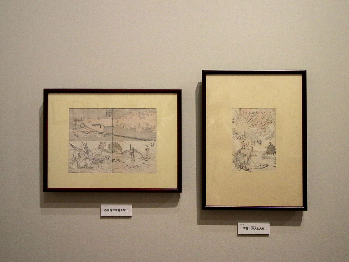 「浦上コレクション・北斎漫画~画狂!画驚!!画叫!!!」の北斎漫画11編「西洋砲で海魔を撃つ」と「短銃の図面」