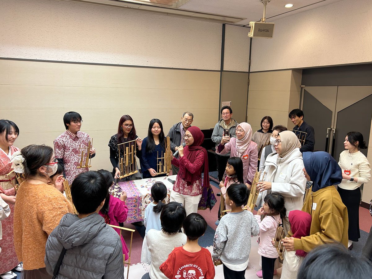 「色んな国の人と出会おう!遊ぼう!話そう!」でみんなでインドネシアの伝統的な楽器アンクルンを演奏する様子