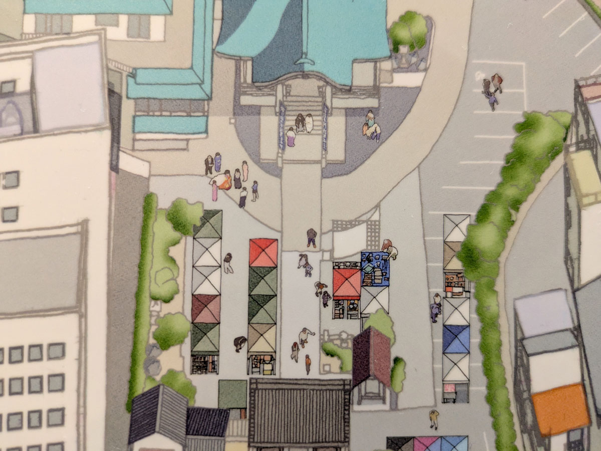 岡山神社・鳥瞰図に描かれている岡山神社で蚤の市の様子