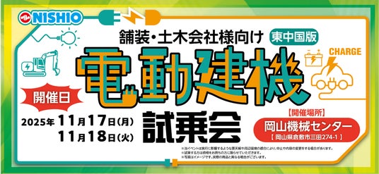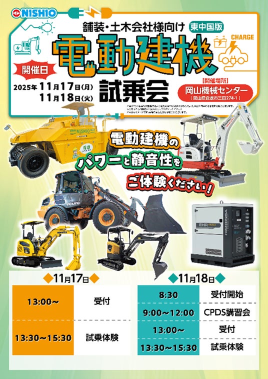 この度、ニシオホールディングス株式会社傘下の西尾レントオール株式会社(本社:大阪府大阪市、代表取締役社長:西尾公志)は、11月17日(月)・11月18日(火)の2日間にわたり、に当社の岡山機械センターにて土木・舗装会社向け「電動建機試乗会」を実施いたします。