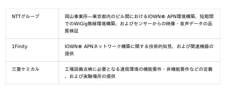 NTT東日本株式会社、NTTドコモビジネス株式会社、NTTドコモソリューションズ株式会社、株式会社NTTデータグループの4社 (以下、NTTグループ)、富士通グループの1Finity株式会社 (以下、1Finity)、および三菱ケミカルグループの三菱ケミカル株式会社 (以下、三菱ケミカル) は、IOWN(R) APN[注1] およびAIの活用によるスマートメンテナンスの実現を通じて、屋外に設置された工場設備を点検する作業員の負担軽減に取り組んでいます。