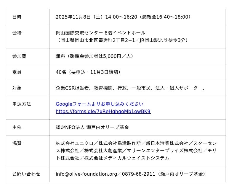 認定NPO法人瀬戸内オリーブ基金(所在地:香川県小豆郡土庄町豊島、理事長:岩城裕)は、創立25周年を記念し、2025年11月8日(土)に岡山国際交流センターにて「 学びの島・豊島から考える環境教育の未来」をテーマとした記念式典を開催します。