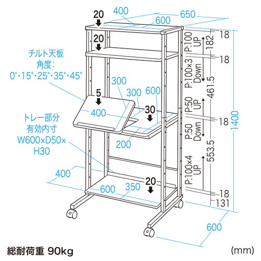 天板の傾斜を5段階で変えることができるパソコンラックです。
