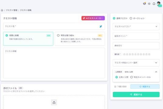 クエスト投稿時には、クエストの種類の選択、必要なポイント数、締め切り、優先度、参加メンバー、公開範囲などを設定可能。チーム全体での協力体制も自然と整います。