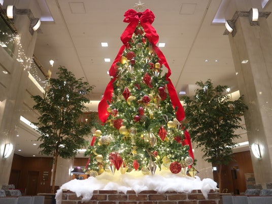 大きな赤いリボンが目を惹く、ロビーを彩るクリスマスツリー
