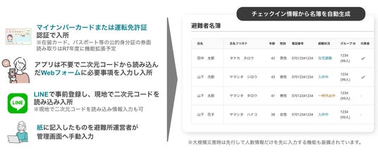 今回用いる避難者マネジメントシステムは、複数のサービスを統合し共通のプラットフォーム上で提供しております。避難所の所在や混雑状況の把握を可能とするWEBサービス「VACAN Maps」及び管理者向け機能「VACAN Console」では、避難所で集計された名簿の人数情報をもとに、避難所のリアルタイム混雑状況を自動的に可視化する機能も有しております。本機能により、避難所の入所者数と混雑状況がリアルタイムで管理画面とマップに反映され、職員や災害対策本部は追加作業なく状況を把握でき、住民も適切な避難先の選択が可能です。