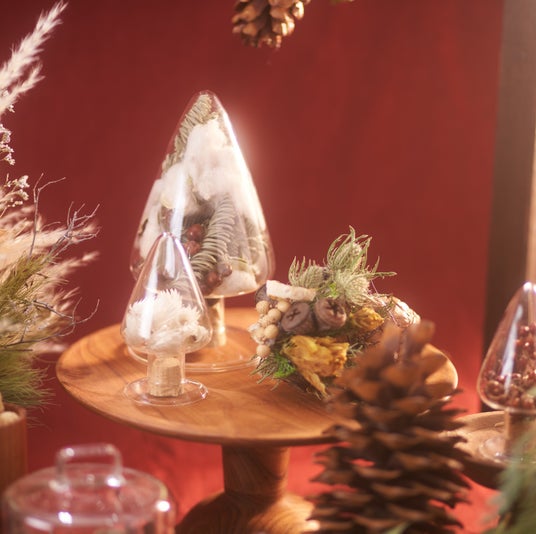 土と風の植物園「ガラスのクリスマスツリーづくり」お好みのドライフラワーをお選びいただき、ガラスのクリスマスツリーを作成できます。お部屋をさりげなくクリスマスカラーに染めてくれるアイテムです。
