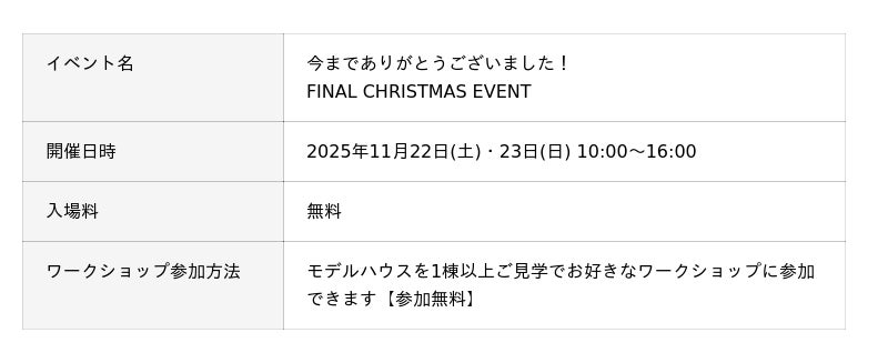 これまでのご愛顧に感謝を込めて、11月22日(土)・23日(日) の2日間、「FINAL CHRISTMAS EVENT」を開催いたします。