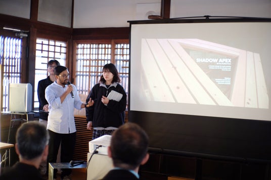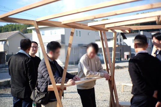 制作期間は11月8日から16日までの9日間。11月10日には参加学生が当社岡山工場を訪問し、社員へのヒアリングを実施。工場見学や社員の声を通じて得た洞察が、各チームの設計コンセプトに反映されました。11月15日には津山市内で成果発表会を開催し、各チームがプレゼンテーションを行いました。当社社員およびその家族も参加し、建築作品の意義や魅力を共有しました。