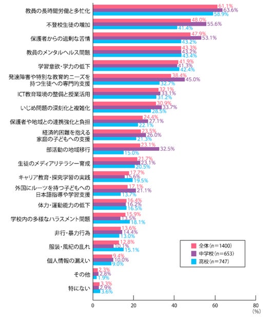 続いて、「不登校生徒の増加」(全体48.0%、中学校55.6%、高校41.4%)、「保護者からの過剰な苦情」(全体47.9%、中学校53.1%、高校43.2%)、「教員のメンタルヘルス問題」(全体43.3%、中学校43.2%、高校43.4%)、「学習意欲・学力の低下」(全体41.9%、中学校41.3%、高校42.4%)、「発達障害や特別な教育的ニーズを持つ生徒への専門的支援」(全体38.4%、中学校45.0%、高校32.7%)といった課題があげられました。
