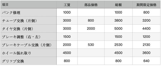 1)車輪関連:パンク、タイヤ交換、チューブ交換、ホイール振れ取り、スポーク交換、ホイール組み直しなどのタイヤ関連の修理(空気入りタイヤおよびスポーク組みホイールに限る)