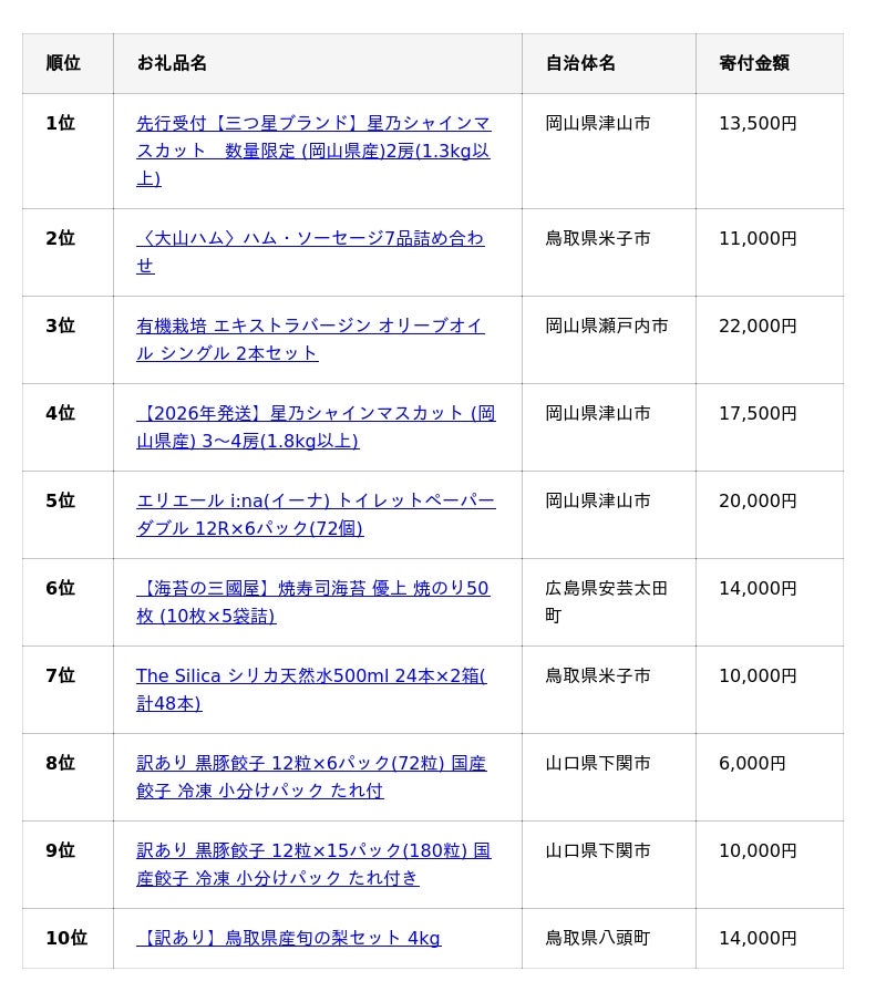 ふるさと納税ポータルサイト「さとふる」を運営する株式会社さとふる(本社:東京都中央区、代表取締役社長 兼 CEO:藤井 宏明)は、「さとふる」における<中国地方版>2025年人気お礼品ランキング(速報)(※1)を発表します。