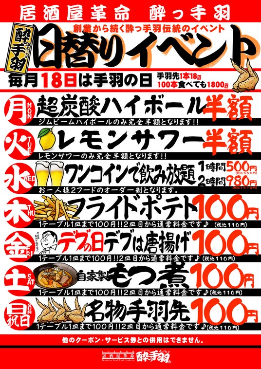 また、毎日「日替りイベント」を開催しており、ハイボールやレモンサワー半額、飲み放題1時間500円、手羽先や唐揚げ100円など、日替わりの特売企画を毎日実施しています。さらに、毎月18日は「手羽(18)の日」として「伝説の手羽先(3本319円、5本429円)」を1本18円の特別価格でお楽しみいただいています。