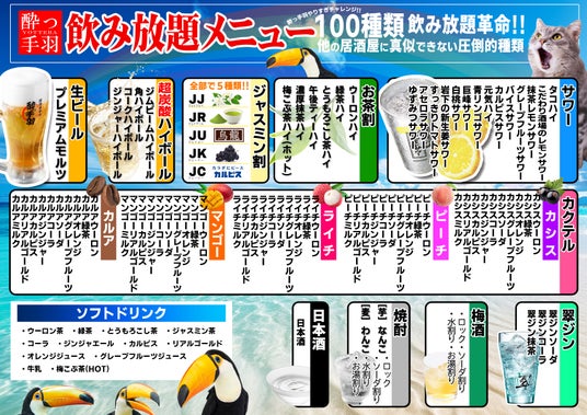 「居酒屋革命 酔っ手羽」は2008年に東京で創業し、気取らずにワイワイと料理やお酒を楽しんでいただける大衆酒場として現在は首都圏を中心に31店舗、フィリピン・マカティに1店舗を展開しています(岡山東口店は第33号店)。「笑って食べて、笑って飲める居酒屋」をモットーに、ユーモラスなポスターやメニューで笑いを誘う一方で、料理とお酒にはこだわりを持ち、質の高い商品をできるだけ安く提供しています。料理のバリエーションは豊富で、肉刺し、揚げ物、餃子や煮込み、サラダ、飯や麺、デザートなど、幅広いジャンルをご用意。中でも「伝説の手羽先」は、お酒との相性を極めた人気の看板メニューであり、手羽先料理コンテストの「第10回手羽先サミット」と「第15回からあげグランプリ手羽先部門」でダブル金賞を受賞した自慢の逸品です。ドリンクもバリエーション豊富に取り揃えています。