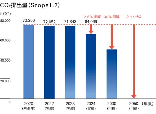 アルフレッサグループは、気候変動に関連する重要指標の一つであるCO2排出量について、2050年度にCO2排出量ネットゼロの目標を設定しており、そのマイルストーンとして2020年度のScope1+2におけるCO2排出量を基準として、2024年度末までに10%、2030年度末までに30%の削減を目指しています。2021年度以降、新たに連結した会社を除いた2024年度のScope1+2におけるCO2排出量は64,069t-CO2で、2020年度比87.4%となり、2024年度の削減目標である10%を上回る12.6%の削減を達成しております。