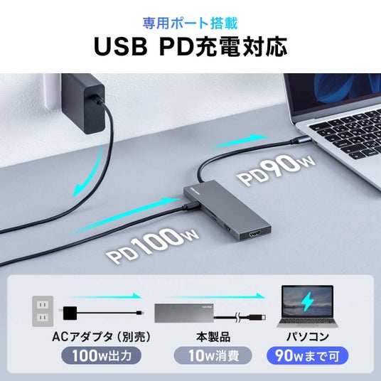 ●USB PD充電に対応しており、最大100Wまでの入力、最大90W(400-DKMP6GMは85W)までパソコンへの出力(充電)が可能です。