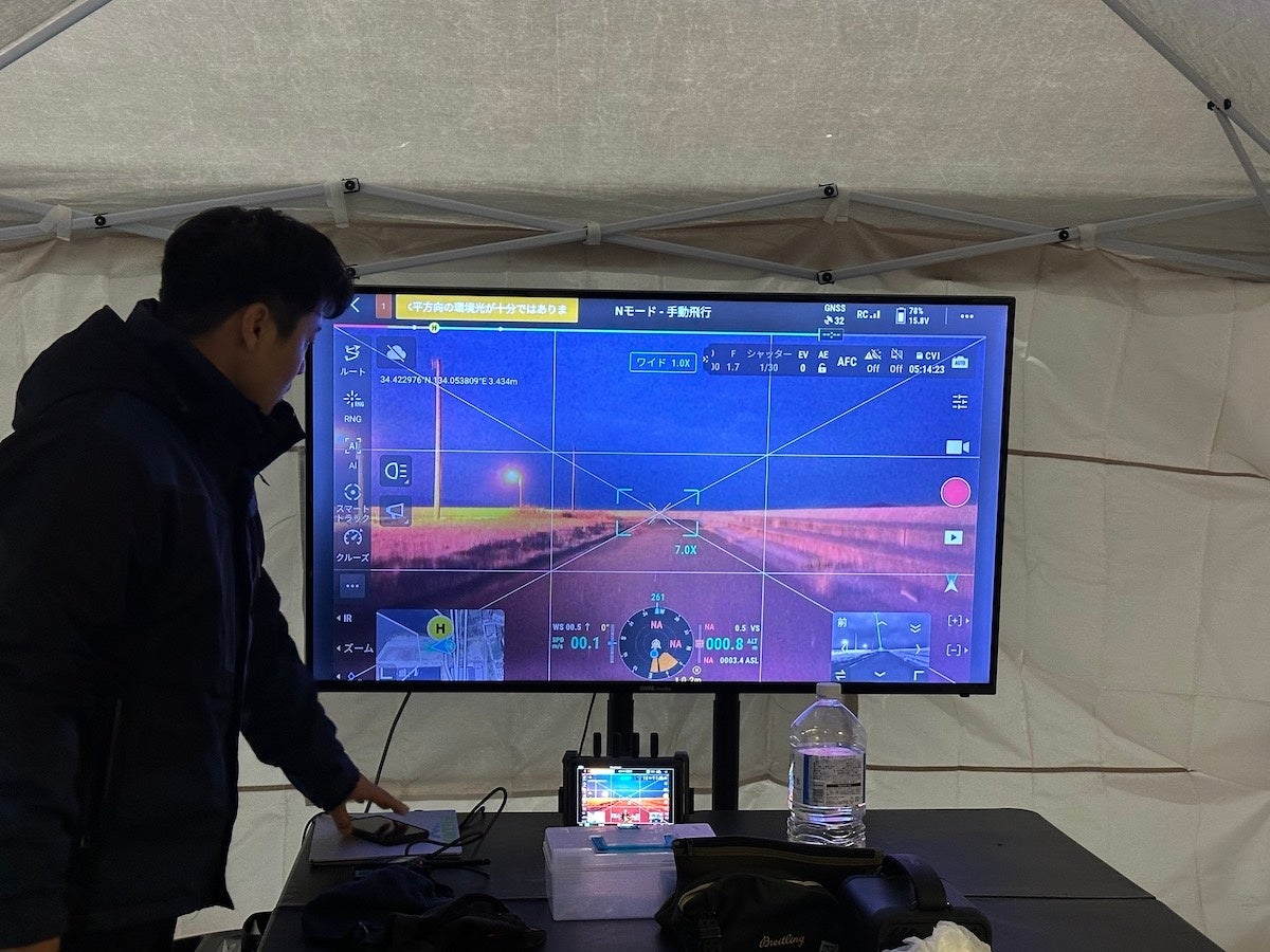 捜索に最適な飛行高度・飛行速度の検証 大型モニターを使用した分割画面による確認手法 日中と夜間での捜索・撮影技術の違いを体験