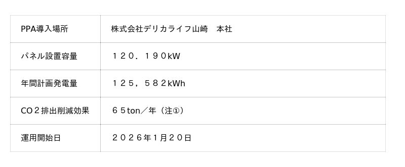 株式会社デリカライフ山崎はスーパー向けの寿司の開発・製造・卸販売をおこなっています。本件では2024年5月に完成した本社工場の屋根を活用したオンサイトPPAによる再エネ導入を推進し、使用電力の脱炭素化を進め、CO2排出量削減に取組んでまいります。