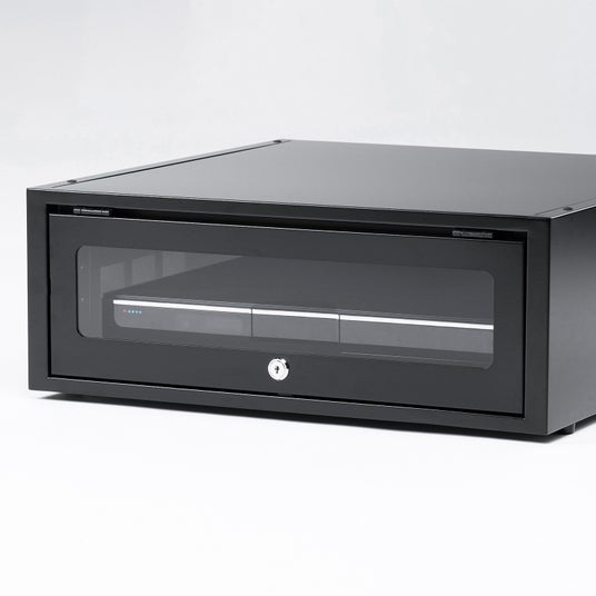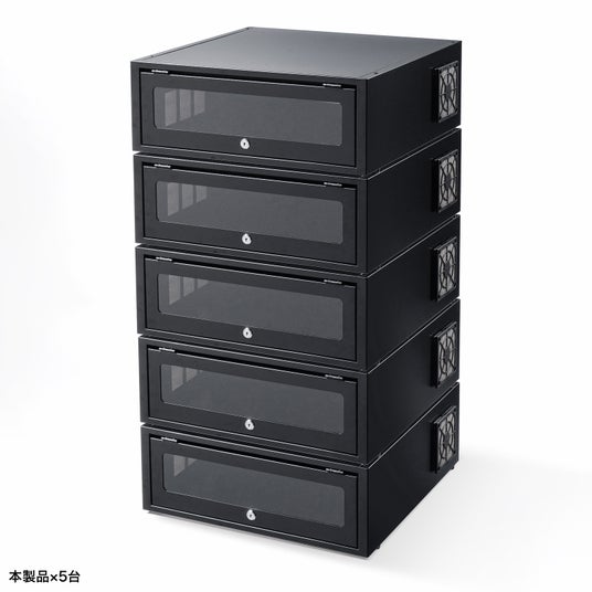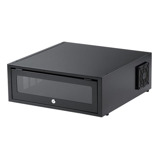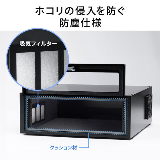 前扉にアクリル板を採用し内部の稼働状況を目視で確認できます。放熱用ファンを標準装備しており、大切な機器を安全かつ安定した環境で管理できます。