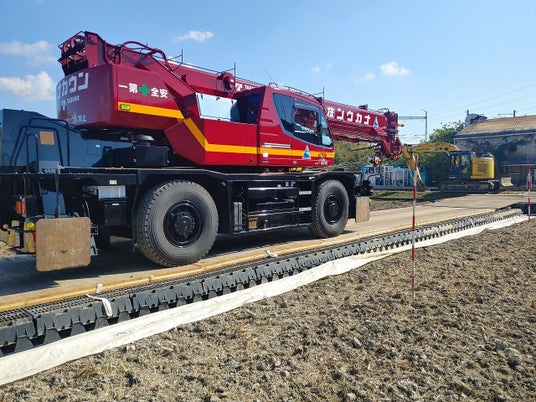 ハイパーCLT敷板(NETIS登録番号 TH-250021-A)は、大型クレーンが通行しても耐えられる耐久性を持つ。