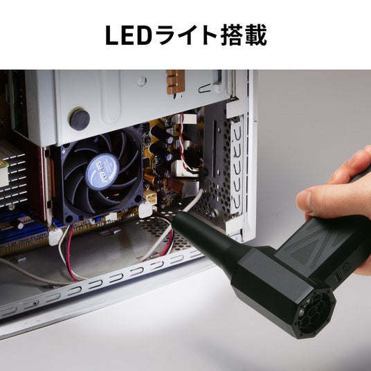 通常のエアダスターに比べ、繰り返しの購入が必要なく、ガスの匂い、缶の処理、火気による危険がありません。