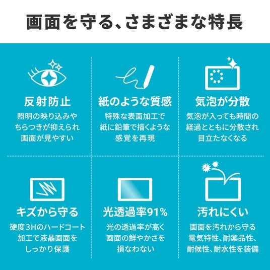 反射防止加工により周囲の映り込みを抑え、液晶画面を傷や汚れから守ります。