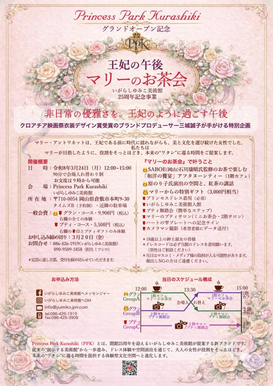 2026年3月24日には、国際的な衣装デザイン賞を受賞した三城誠子プロデュースによる、和洋折衷のアフタヌーンティーイベント「王妃の午後 マリーのお茶会」を開催。地元の銘茶やドレス体験が融合した、新たな倉敷観光の形を提案します。