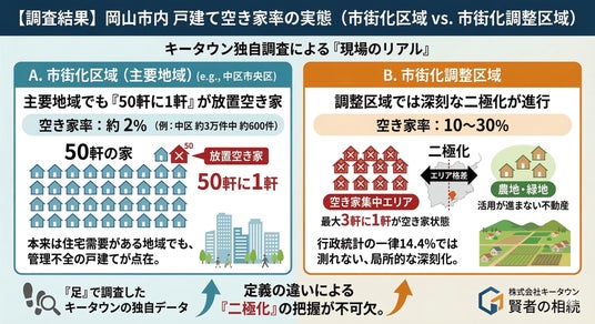 株式会社キータウン(岡山県岡山市、代表取締役:柴山貴志)は、岡山市内の戸建て住宅約21.5万戸のうち、約3万件を対象に、1年間にわたる独自の空き家実態調査を実施しました。