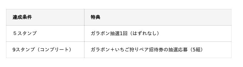 サウスヴィレッジ内の9店舗を巡るスタンプラリーを同時開催。各店舗で600円以上(税込)のお買い物をするとスタンプが1つ貯まり、5スタンプでガラポン抽選に挑戦できます。ガラポンははずれなしで豪華景品が当たるチャンスも。9スタンプのコンプリート達成者には、ガラポンに加えていちご狩りペア招待券(5組)の抽選にも応募できるダブルチャンスが待っています。