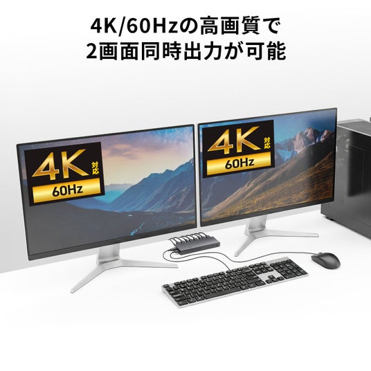 本製品は、4K解像度に対応したディスプレイ2台を同時に接続でき、広大な作業スペースを維持したままワンタッチでパソコンの切り替えが可能です。複雑な配線を1か所に集約し、デスク周りをスッキリさせながらマルチタスク環境を強力にサポートします。