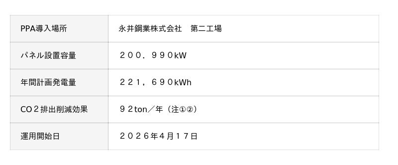 永井鋼業株式会社は一般鋼材の製造・加工販売をおこない、環境分野では兵庫県SDGs債の投資をおこない、CO2排出量削減を重点的に取組んでいます。本件では第二工場の屋根を活用したオンサイトPPAによる再エネ導入を推進し、使用電力の脱炭素化を進め、今後も地域の環境負荷低減を目指します。